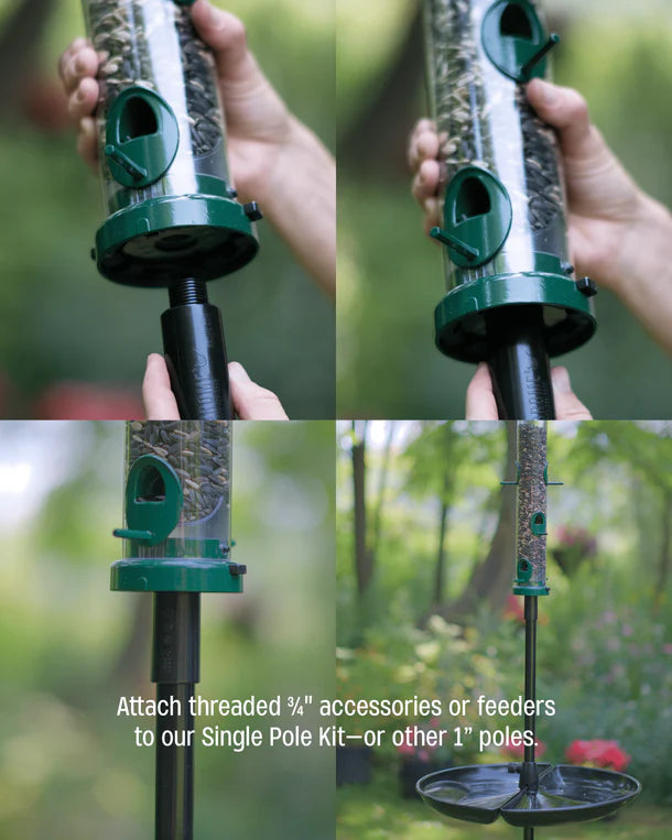 Use this accessory to pole mount feeders or birdhouses. It allows you to securely attach your threaded ¾" accessories to our BirdsUP® Single Pole Kit, or to any 1" pole.