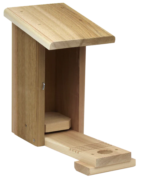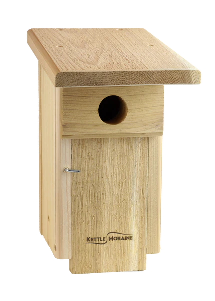 A good bluebird box should be more than just a cavity for a bird to build a nest in. It should be easy to monitor, easy to clean, and provide a safe nesting site. This one has it all! It is very easy to monitor and clean with the flip-down front panel. Grooves below the exit give the bluebirds additional traction, and help out the fledglings. Ample ventilation just under the roofline and drainage holes on the bottom keep the nest dry and comfortable. It is a very strong cedar box that will last many years.