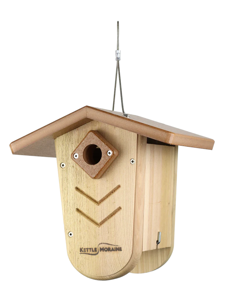 This attractive bird house will keep your wrens and chickadees safe while raising their young. With a large overhang roof for shade, a recycled predator guard to keep larger birds out, and easy side clean out, this sturdy cedar house will last for years!