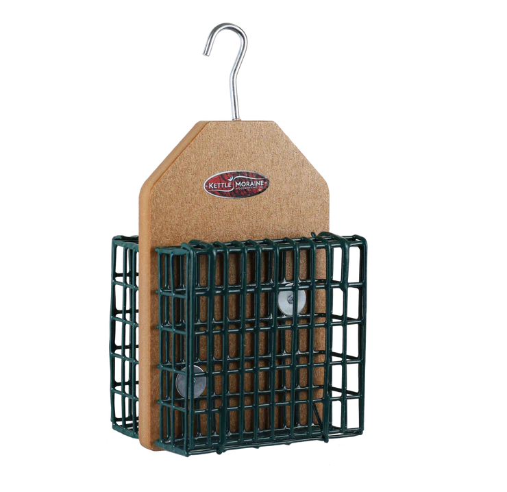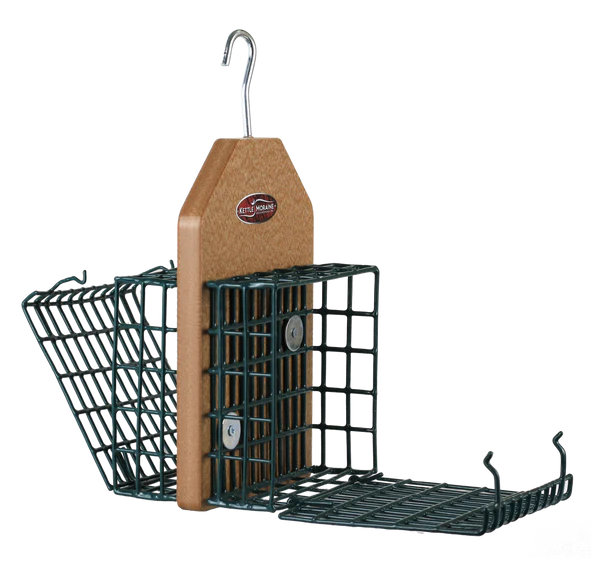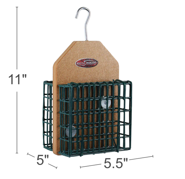 This classic recycled suet feeder will be popular with many of your wild bird visitors. Suet cage feeders are ideal for woodpeckers, chickadees, titmice, and nuthatches who can cling easily to the top and sides. Double sided means there's enough room for everyone!