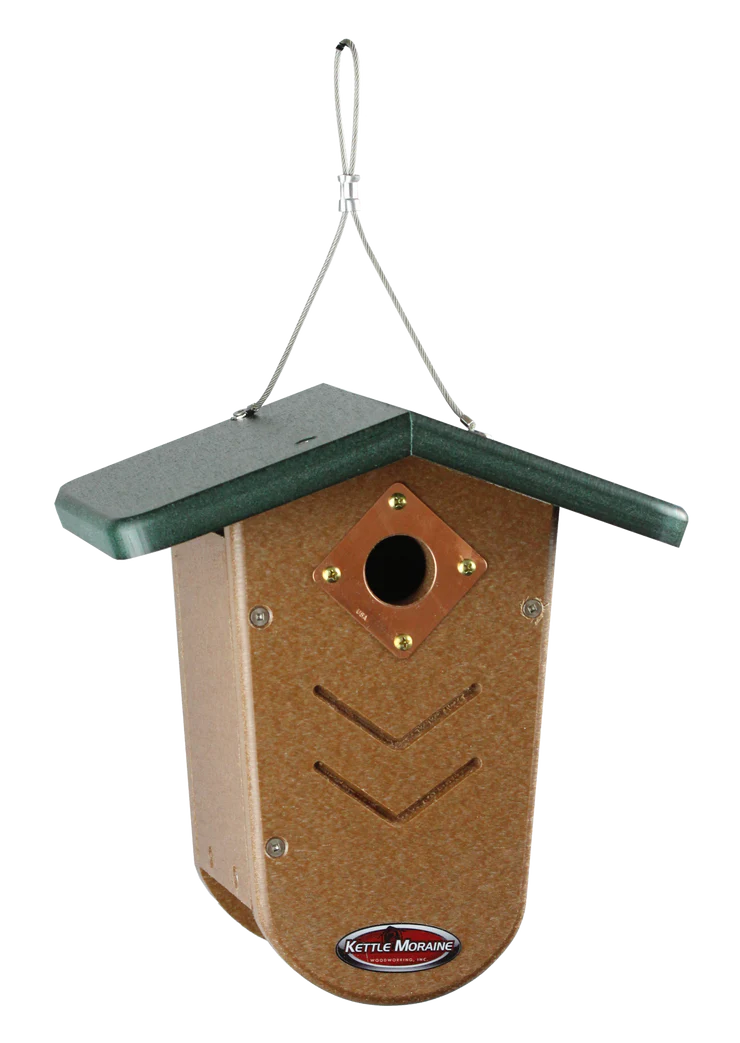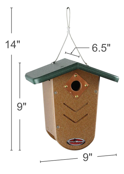 The Moraine Nest Box is ready to hang straight from the box. Constructed of lumber made of recycled milk jugs and secured with stainless steel screws, this very sturdy birdhouse will last for many, many generations of baby birds.