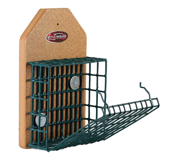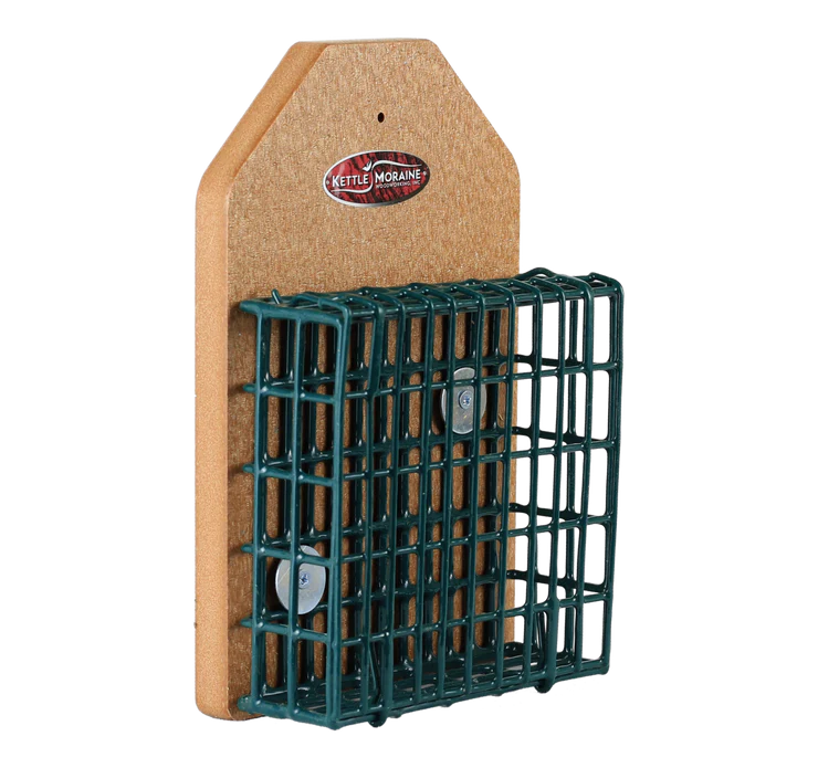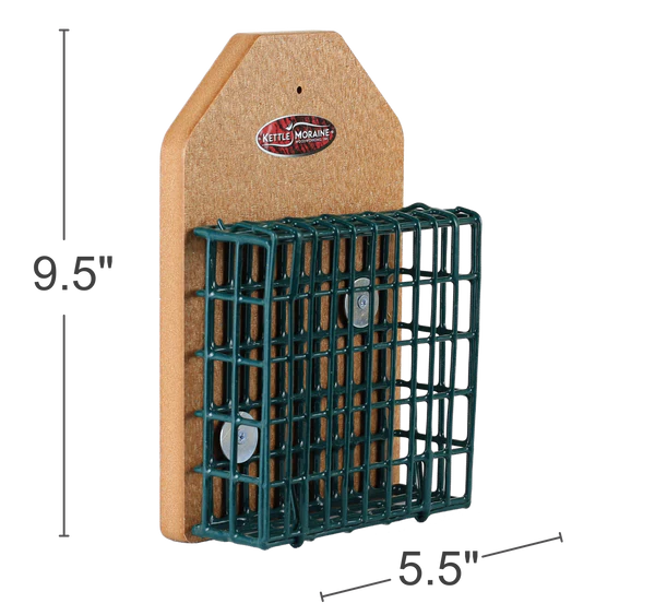 Secure this recycled suet feeder to a tree or post to attract nuthatches, chickadees, and titmice. Suet cage will hold one standard cake. Easy to replace suet with flip-down front opening!