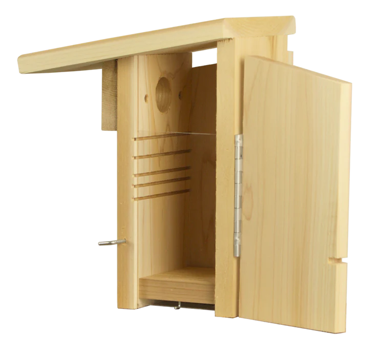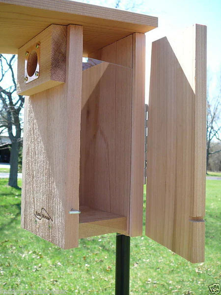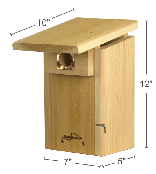 A good bluebird box should be easy to monitor, easy to clean, and provide a safe nesting site. It should be more than just a cavity for a bird to build a nest in. This one has everything your bluebirds need! It is very easy to monitor. The side has a hinged door with a viewing window to keep nestlings secure. When it is time to clean the nest, the viewing window slides out to provide full access to the box. The copper portal around the entrance maintains the 1½” entry. Predators will not be able to chew the entrance to make it larger. There is plenty of ventilation just under the roofline and drainage holes on the bottom to keep the nest dry. It is truly SUPER and top of the line. An information sheet is included with the nest box.