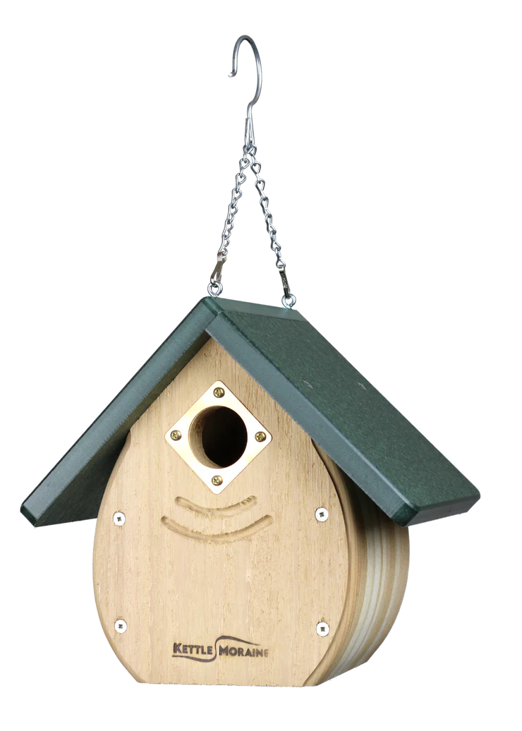 This charming nest box is ready to hang straight from the box. It is designed as the perfect size for wrens or chickadees. The bottom removes for easy cleaning. The Tear Drop is a very sturdy house that will last for many years!