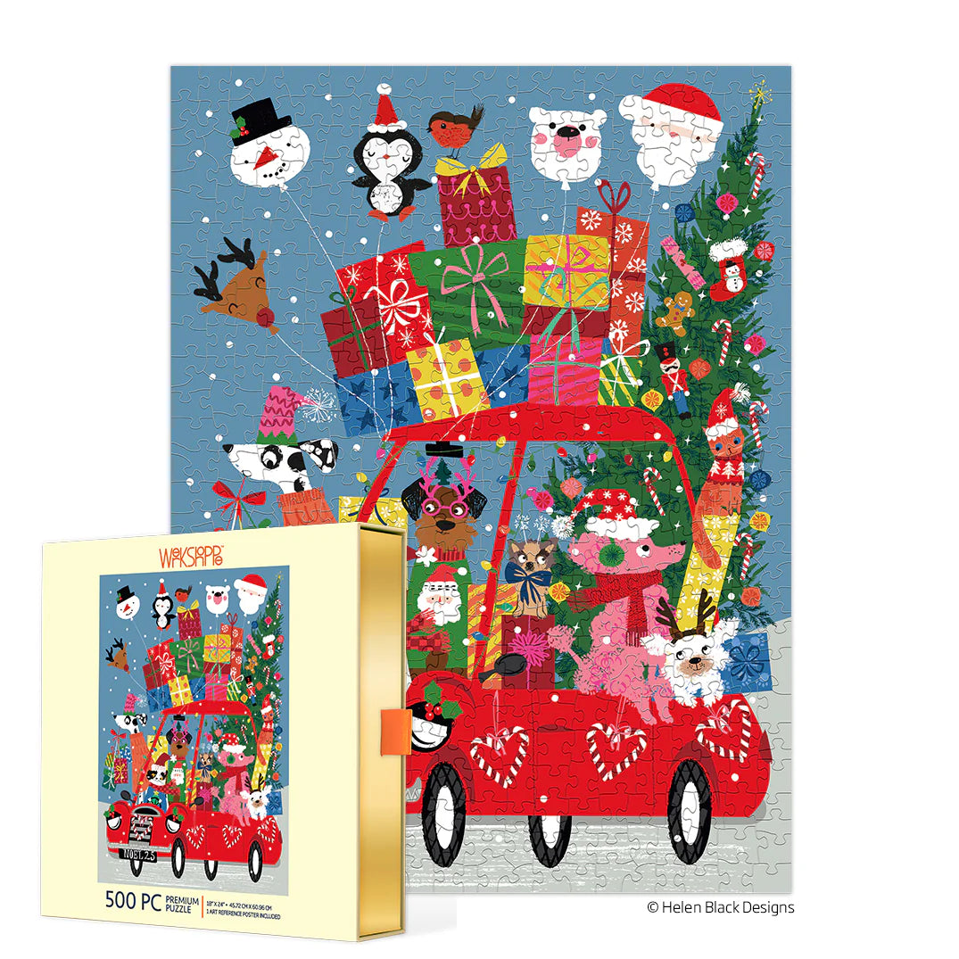 Buckle up for a joyful ride with the Festive Fun Car puzzle! This 500-piece holiday adventure features a cartoon car packed with playful cats and dogs, gifts stacked high on the roof, and plenty of festive charm to go around. With bright colors and whimsical details, it’s the perfect cozy activity to get you in the holiday spirit—whether you're puzzling solo or sharing the fun with friends and family.