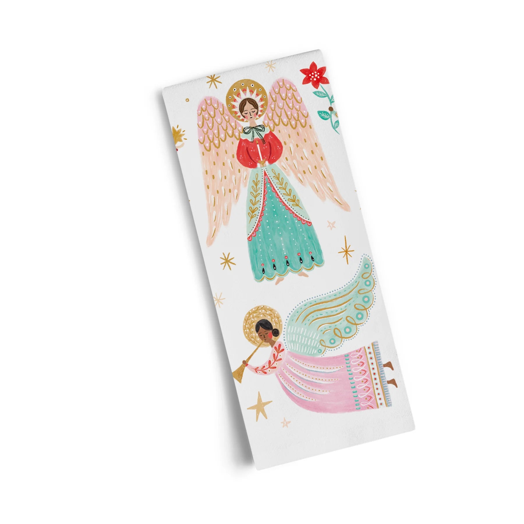 Bring a touch of peace and beauty to your kitchen with the Heavenly Angels tea towel. This 100% cotton towel features radiant angels in flowing robes, surrounded by shimmering stars and soft pastel hues of gold, pink, and blue. Thoughtfully designed to blend holiday tradition with everyday function, it adds a serene, festive accent to your seasonal décor.