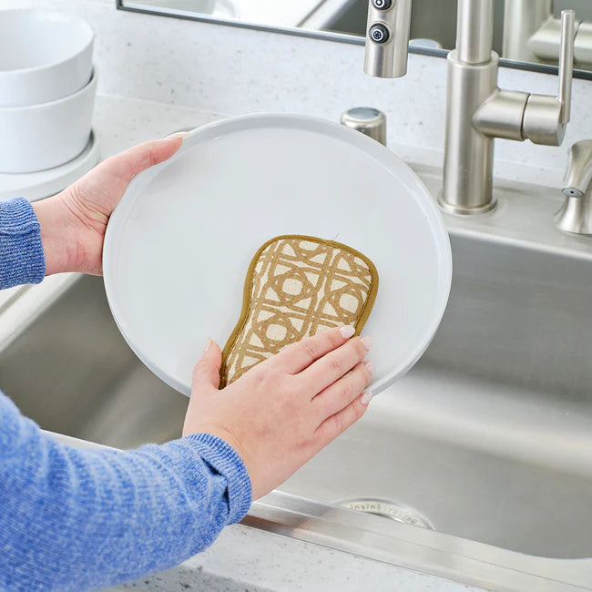 A set of 4 hard working microfiber scrubbies consists of 2 coordinating designs - a green ground herbal botanical and a natural woven lattice pattern. These are perfect kitchen clean up helpers.