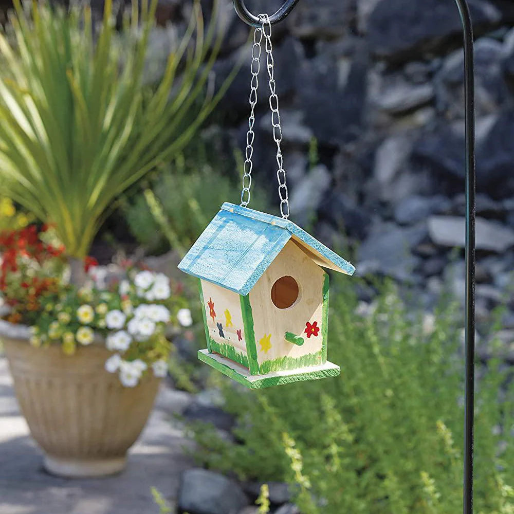 This best-seller is a great anytime craft activity for families and kids ages 5+. Each DIY build-and-paint birdhouse kit includes 7 FSC-certified wood birdhouse pieces, nails, a metal hanging chain, 2 hooks, glue, 1 paintbrush, and 4 paints in assorted colors. Available in packs of 6 or cartons of 24. Hammer not included: adult supervision and support required.