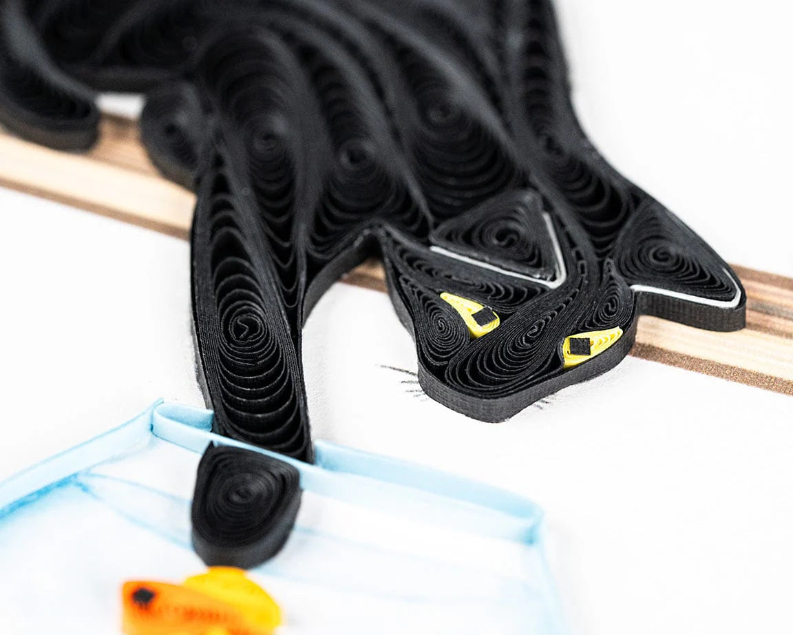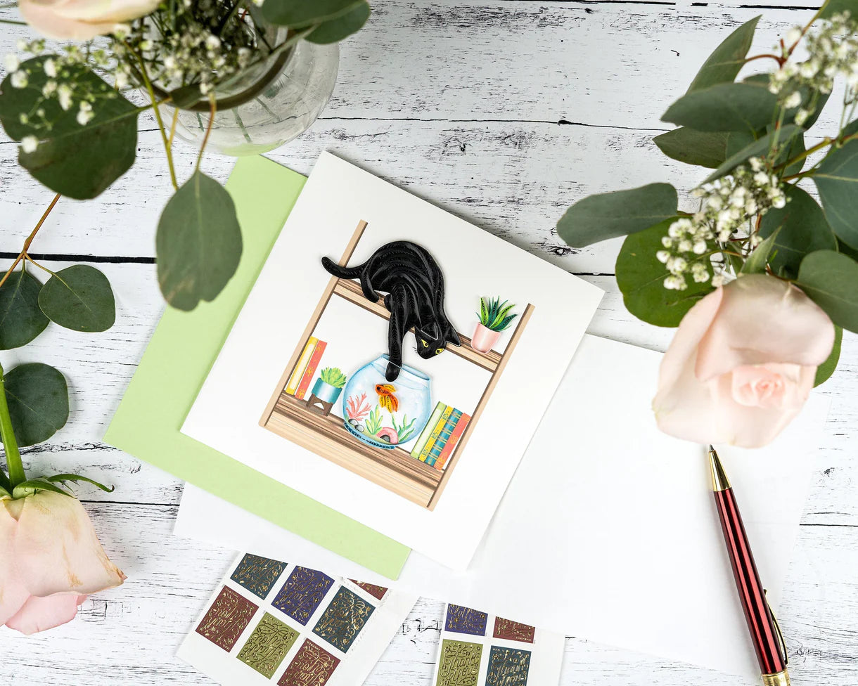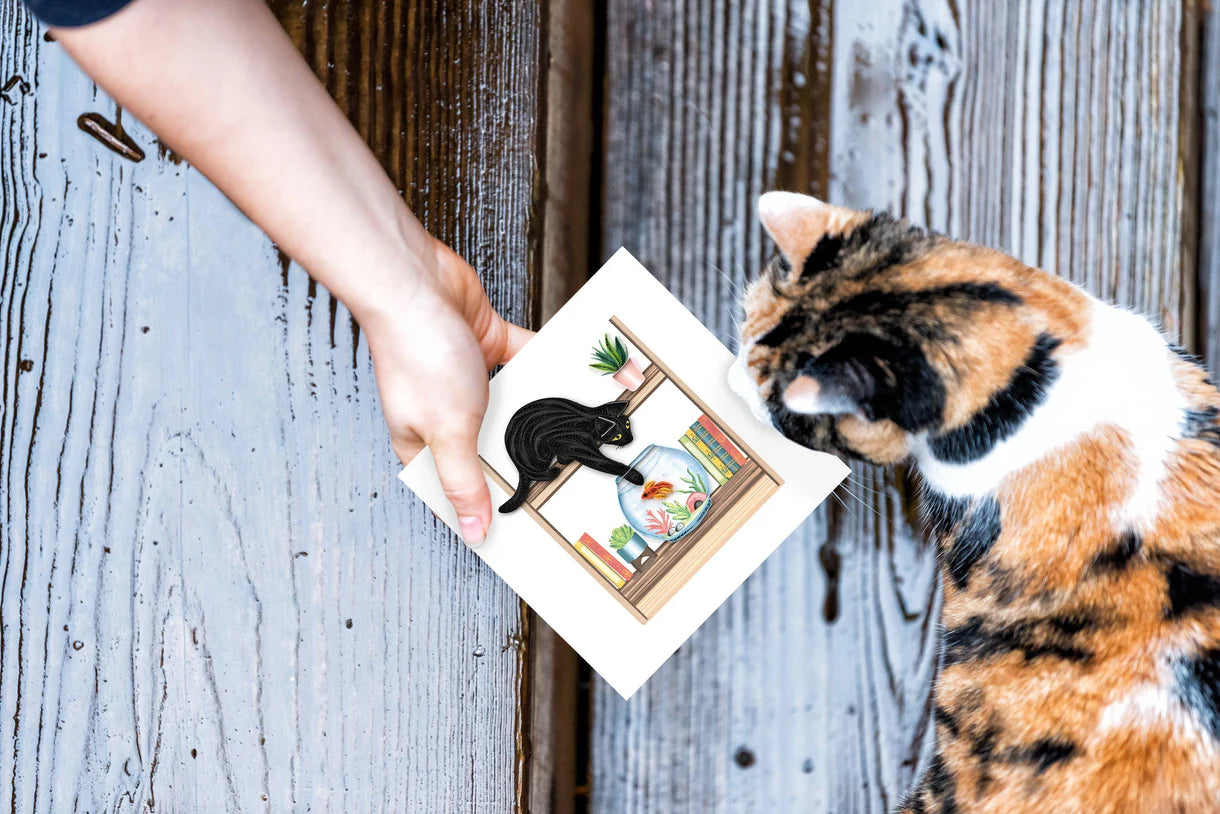 Get ready to "paws" for a chuckle! Our Mischievous Cat card is a real "meow-sterpiece" for cat aficionados. This whimsical card showcases a cunning black cat on a shelf, sneakily testing the waters by dipping its paw into a fish bowl – it's a guaranteed laugh and "claw-some" charm for any special moment!