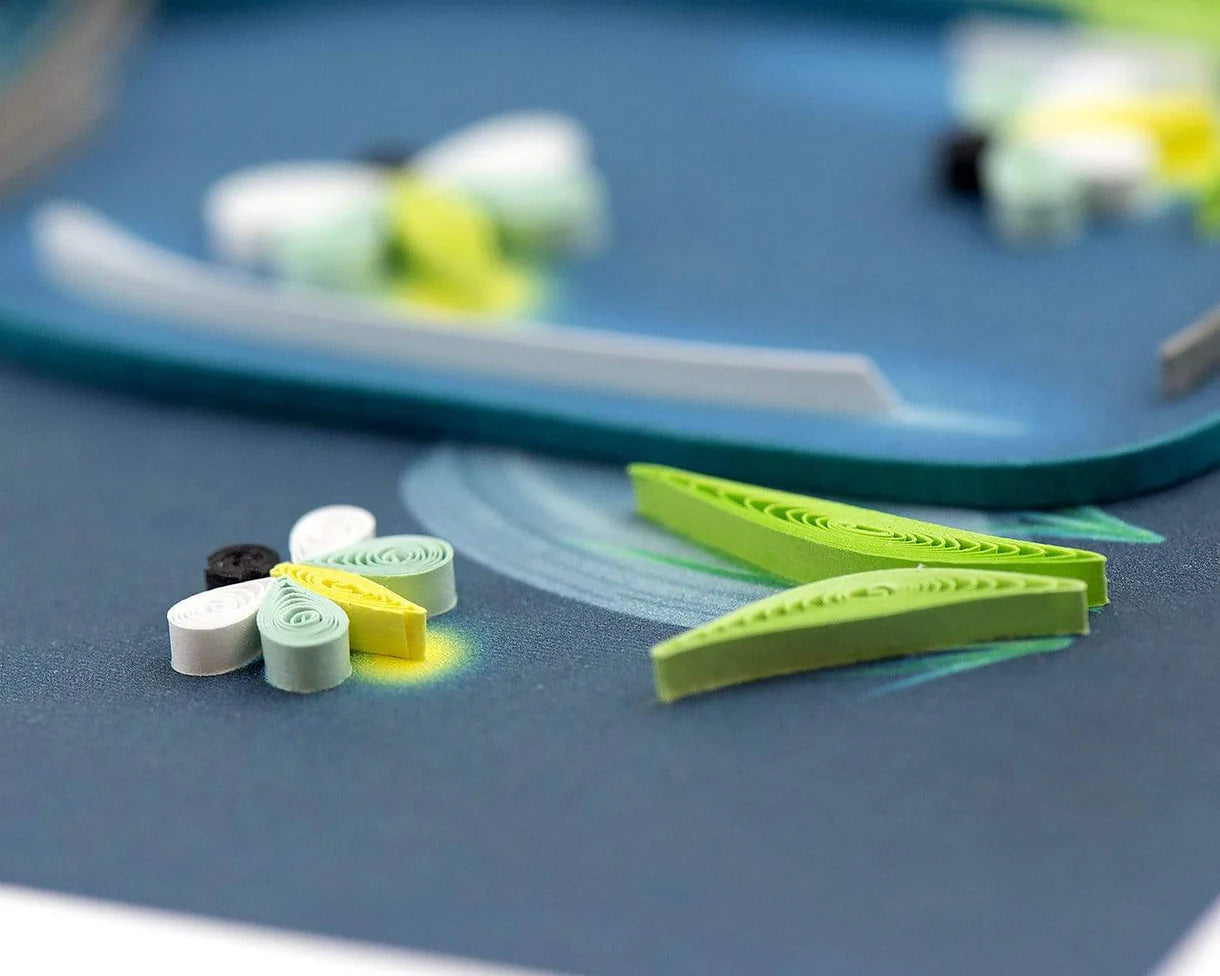 Send this beautiful quilled Fireflies Greeting Card to a loved one for any occasion! Many people treasure memories of catching fireflies as kids. A nostalgic act associated with warm summer nights.The design includes a mason jar filled with quilled fireflies sitting in a small patch of grass on a printed background of dark blue.